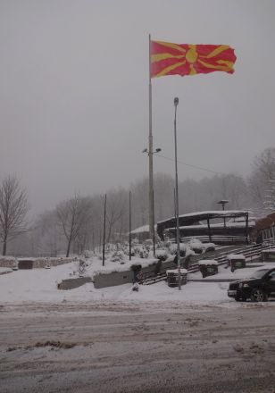 Åter på en buss. Vi färdades genom västra Makedonien; emellanåt på hög höjd. I närheten av Kičevo pausade vi intill ett vägkafé. Den makedonska flaggan smattrade i vinden; det var mulet och rätt mycket snö.