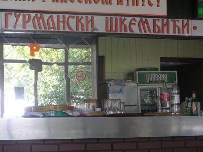 Skylten med den kyrilliska texten på busstationens restaurang förkunnar att man här kan äta "gurmanski škembići", det vill säga "inälvor för finsmakare" (till exempel komage). Jag valde dock något annat. Därefter styrde jag stegen mot vandrarhemmet "In old shoes", som ligger ett stenkast från busstationen. Här bodde jag också under mitt förra besök. Jag checkade in på det trivsamma vandrarhemmet som ligger några trappor upp i ett slitet grått hus vid den hårt trafikerade Brankova-gatan.