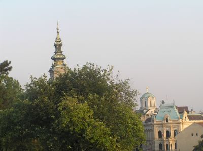 Två kyrkor. Fotot är taget på Kalemegdan, som byggdes som en osmansk fästning och där man nu finner parkanläggningar och planer där man kan sporta.