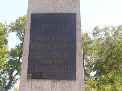 Monument med slovakisk text: Till hjältarna i kampen och arbetet för befrielsen av vårt folk, 1944-1945, i evigt minne.