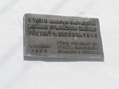 Skylt med slovakisk text: I denna byggnad började Slovakiska realgymnasiet att verka den 1 oktober 1919. Kommittén för firandet av 50-årsjubileet av Slovakiska gymnasiet i Petrovec. 4 oktober 1969.