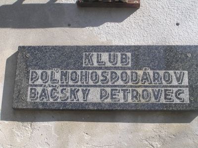 Skylt med slovakisk text: Jordbrukarnas klubb. Báčsky Petrovec.