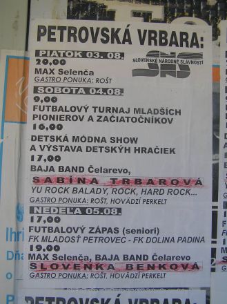 Mellan den tredje och femte augusti hade slovakerna en festival, "Petrovská Vrbara", med musikuppträdanden, fotbollsmatcher, en show med barnmode och utställning av leksaker, och så mat: perkelt samt grillat kött. Affischen är skriven på slovakiska.