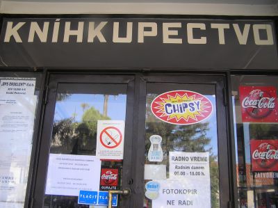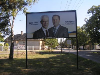 Politisk reklam skriven på slovakiska: "Rösta på Boris Tadić, vår kandidat i presidentvalet. Rösta på Ján Bohuš, vår ledamot i Vojvodinas parlament." Tadić förlorade i det senaste serbiska presidentvalet mot Tomislav Nikolić. Ján Bohuš är slovak och ställde upp i valet till parlamentet i Vojvodina (ej att förväxla med det allserbiska parlamentet i Belgrad).