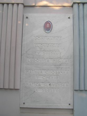 Skylt uppsatt på det hus där den slovakiska kulturorganisationen MSS (Matica Slovenská v Srbsku) huserar.