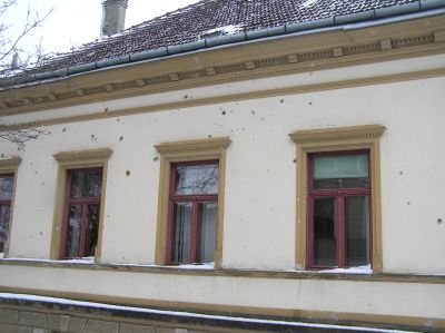 En husfasad bar spår av beskjutning. Under kriget fick många barn från Daruvar och trakten omkring (mestadels tjeckiska barn) komma till Tjeckien.