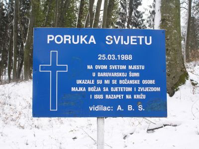 "Kungörelse till alla människor/ 25.03.1988/ På denna heliga plats i Daruvars skog uppenbarade sig gudomliga gestalter för mig: Guds moder med ett barn och en stjärna samt Jesus upphängd på korset".