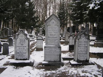 Tre gravstenar bredvid varandra. Överst på den mellersta en inskription på hebreiska, därunder på tyska: "Albert Bresslauer dog i sitt artonde levnadsår den 22 maj 1889." Därunder står på kroatiska: "Dog i läger: Robert och Irma" samt "Dog i NOB: dottern Andjelija".