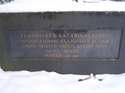 "Flajšhaker, Katarina och Beni (...)". Därefter: "Dog i läger: Flajšhaker Betika och Mira (...)".