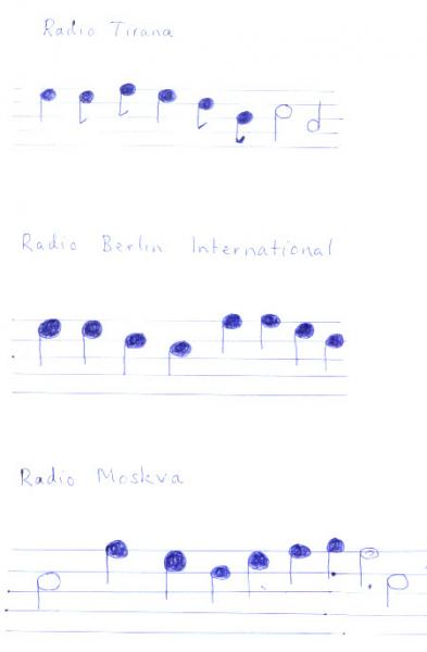 Ett av mina intressen under åttiotalet var att lyssna till utländska radiostationers utsändningar på svenska. På en loppmarknad i Röke hade jag köpt en gammal rörradio och därefter dröjde det inte länge förrän jag upptäckte ”Radio Moskva”, ”Radio Berlin International”, ”Radio Polonia” och ”Radio Tirana” och deras utsändningar på svenska. Även den västtyska radions utlandsprogram, ”Deutschlandfunk i Köln”, lyssnade jag på. Jag kan fortfarande höra de olika stationernas anrop i form av några toner som upprepades ett antal gånger mellan de olika utsändningarna. Radio Moskvas signaturmelodi vet jag inte något närmare om, men den bestod av nio toner (notutskrift, se nedan!). Den östtyska radions anrop eller igenkänningssignal bestod av de åtta första tonerna ur landets nationalsång: ”Auferstanden aus Ruinen und der Zukunft zugewandt…” (notutskrift, se nedan!) Den polska radions signatur bestod av några dramatiska toner ur ett pianoverk av Chopin (tror jag). Mellan varje musiksnutt hördes en röst förkunna ”Radio Polonia”. Första gången jag hörde detta anrop trodde jag mig höra ”Radio Bologna”. Radio Tiranas signaturmelodi utgjordes av åtta sorgsna toner ur sången ”Hackan och geväret”, spelade på trumpet (notutskrift, se nedan!). Den västtyska signaturmelodin, slutligen, har jag fullständigt glömt bort.