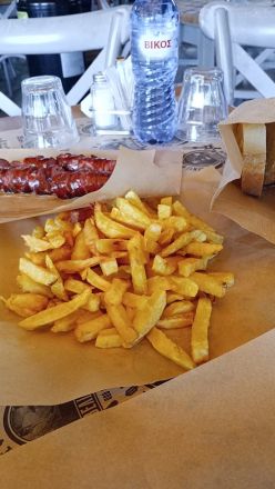 Lunch på en välbesökt psistaria efter besöket på konstgalleriet. En lokal korv, pommes frites och vatten.